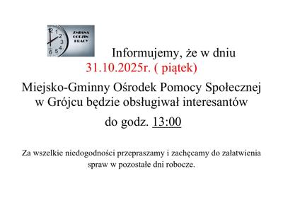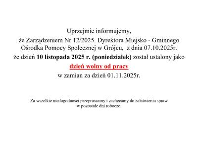 INFORMACJA!!!Uprzejmie informujemy, że 10 listopada 2025 r. Miejsko-Gminny Ośrodek Pomocy Społecznej w Grójcu będzie nieczynny. -